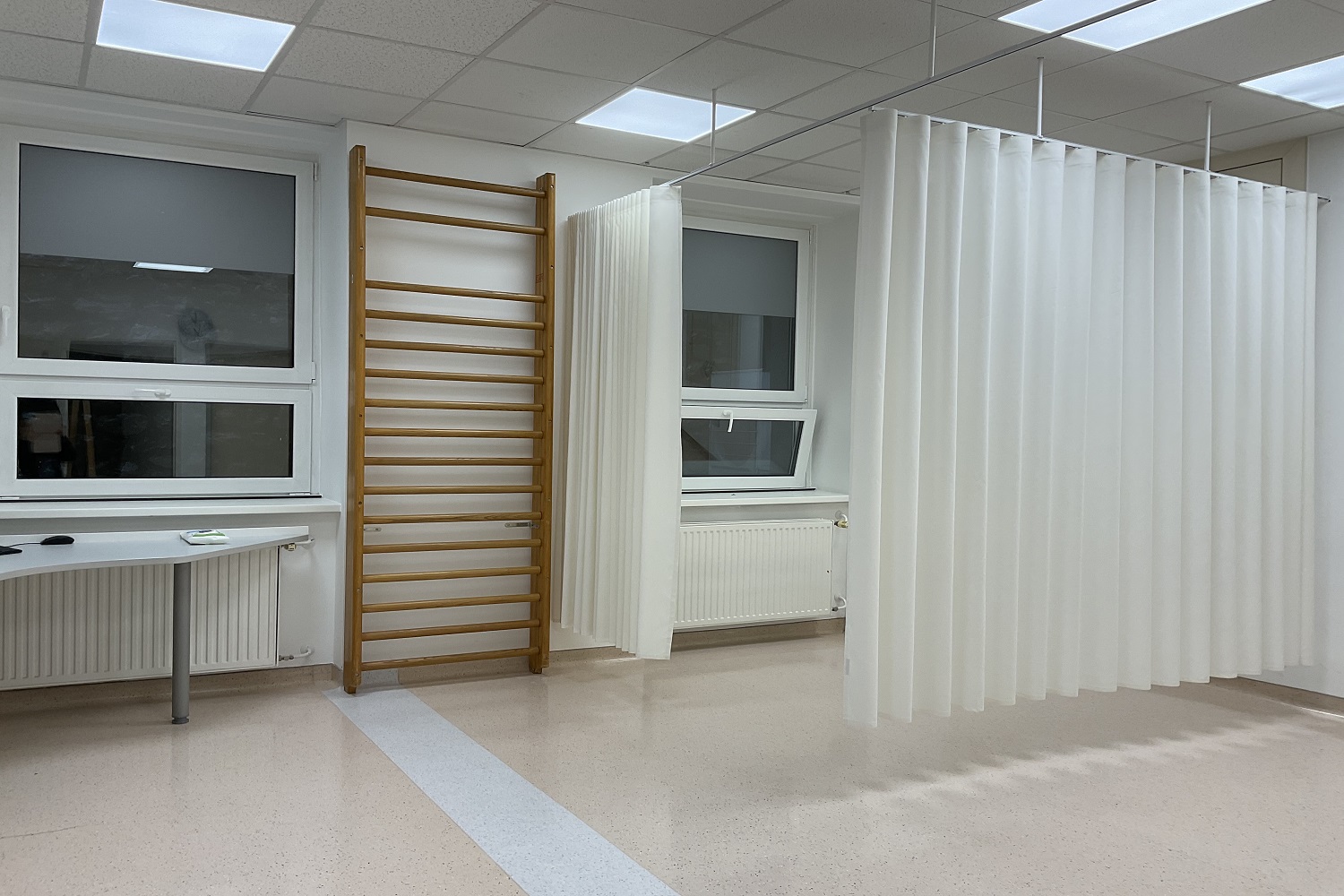 V prostorih oddelka fizioterapije v Zdravstvenem domu Kranj smo izvedli dobavo in montažo zaves, ki omogočajo funkcionalno razdelitev prostora na posamezna terapevtska mesta. Takšna rešitev pacientom zagotavlja potrebno zasebnost med obravnavo, hkrati pa ohranja odprt, svetel in pregleden prostor, kar je v zdravstvenem okolju zelo pomembno. Zavese omogočajo hitro in enostavno prilagajanje prostora glede na potrebe terapije ter število pacientov, zato so primerne za vsakodnevno uporabo.