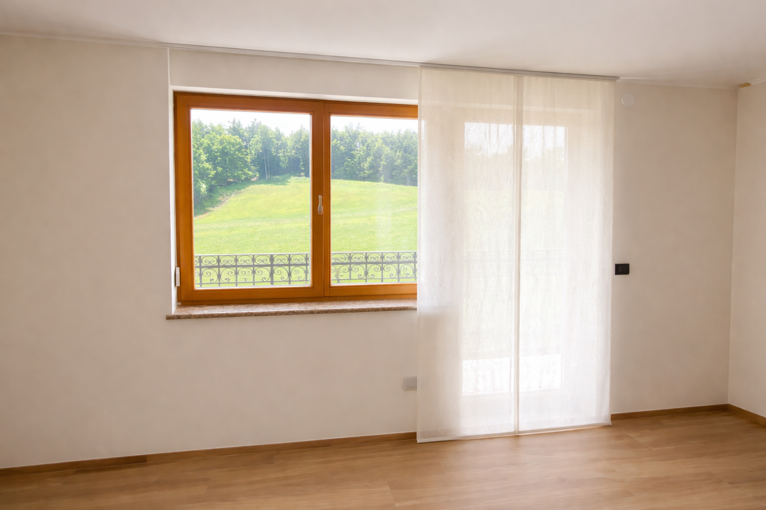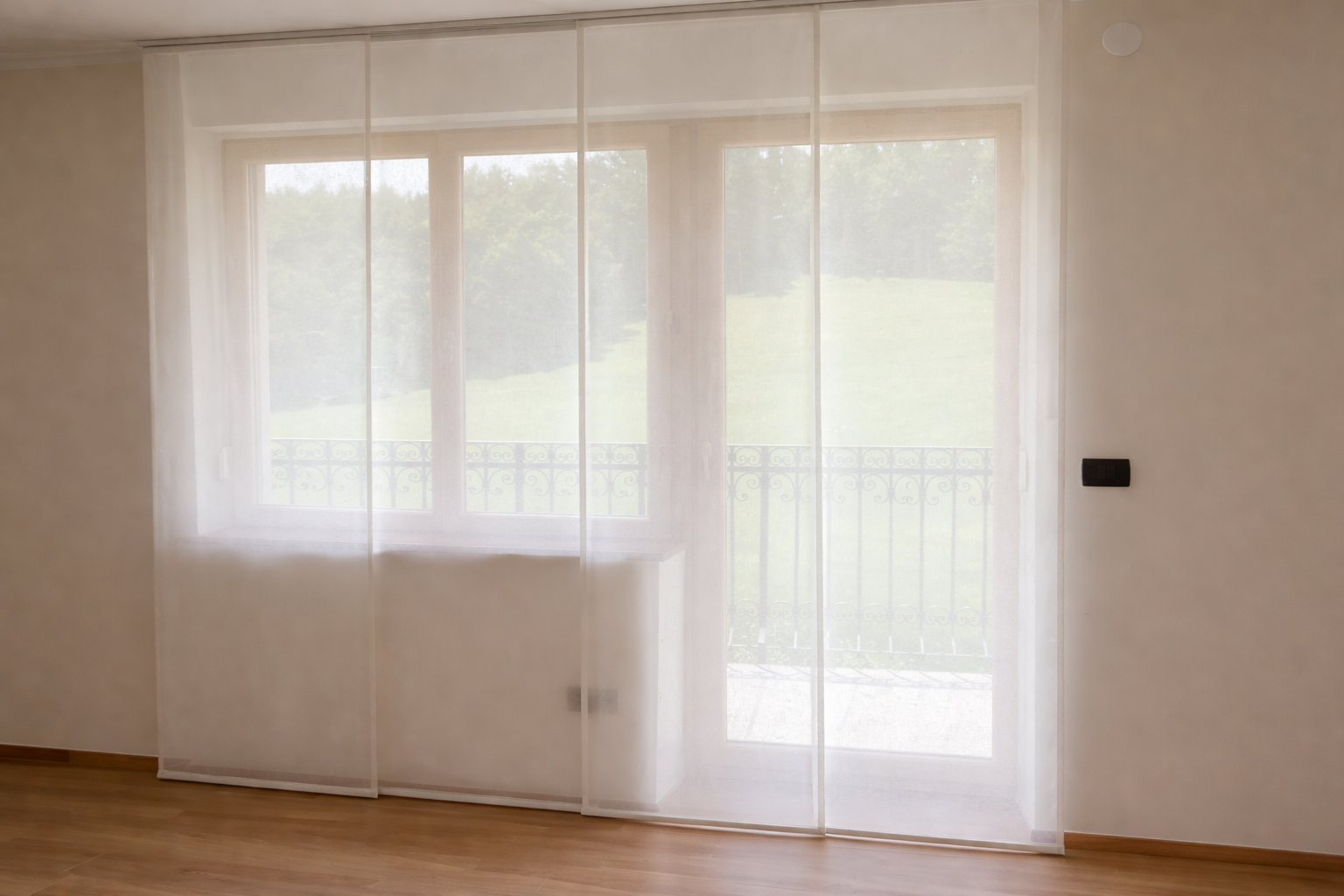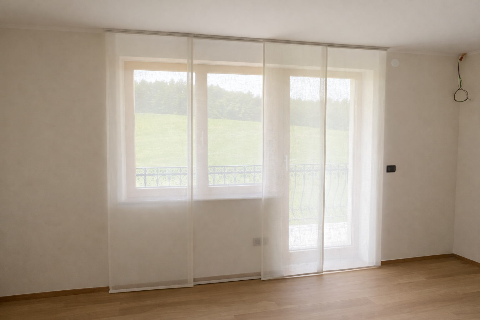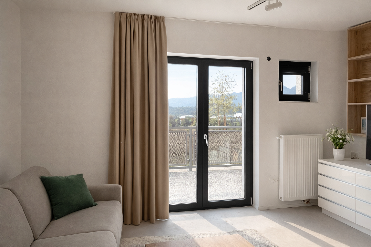 Izbrana je bila prosojna tkanina Corfu v barvi 2, ki ima značilno strukturo mikro mrežice. Ta posebna tekstura omogoča zelo prijetno razpršitev dnevne svetlobe ter ustvarja mehko svetlobno kuliso skozi ves dan. Tkanina deluje lahkotno in naravno, pri tem pa ohranja zadostno stopnjo zasebnosti. Zaradi svoje sestave je primerna za sodobne bivalne prostore, saj združuje estetski videz z dobro obstojnostjo in enostavnim vzdrževanjem. Nevtralni barvni ton se lepo povezuje z lesenimi talnimi površinami in preostalimi elementi opreme ter ustvarja harmonično, brezčasno podobo prostora. Zavese so vpete v stropne karnise KS v beli barvi, ki s svojo minimalistično obliko delujejo zelo diskretno in poudarijo čistost linij interierja. Sistem omogoča tiho, gladko in nemoteno drsenje ter zagotavlja lepo oblikovane, enakomerne valove po celotni dolžini zaves. Montaža po celotni širini stene dodatno poudari horizontalnost prostora in optično poveča njegovo dimenzijo. Takšna rešitev ustvarja občutek povezanosti z zunanjim okoljem, hkrati pa zagotavlja funkcionalnost in udobje bivanja.