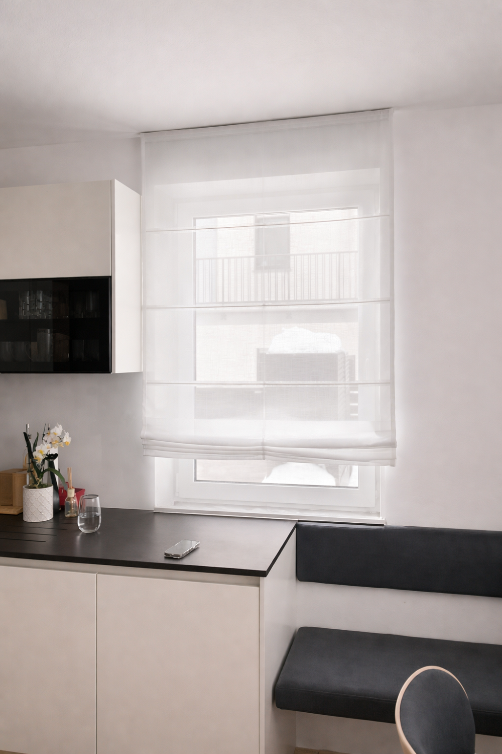 V kuhinji smo namestili gubane roloje, ki združujejo estetsko dovršenost in praktičnost. Njihov enostaven mehanizem omogoča prilagodljivo senčenje glede na potrebe prostora, hkrati pa z nežno teksturo mehčajo svetlobo in ustvarjajo prijetno atmosfero. Naravni ton tkanine se odlično ujema z lesenimi okenskimi okvirji in toplimi odtenki granitnega pulta, kar prostoru doda pridih domačnosti in elegance.