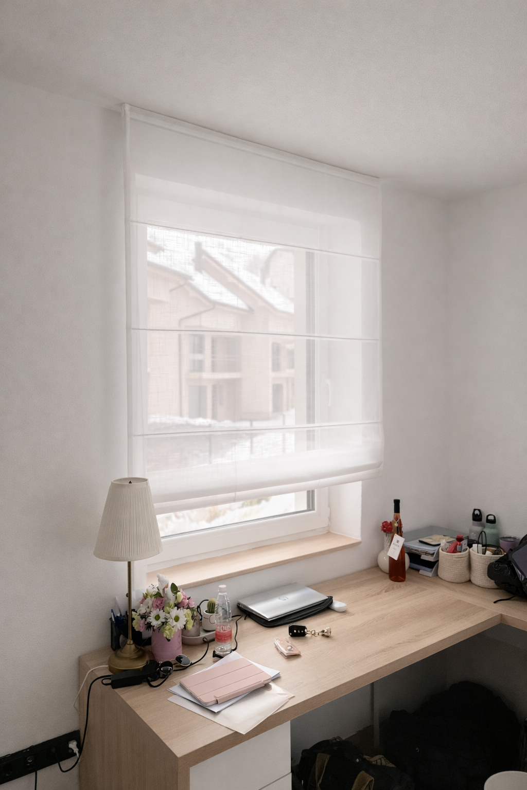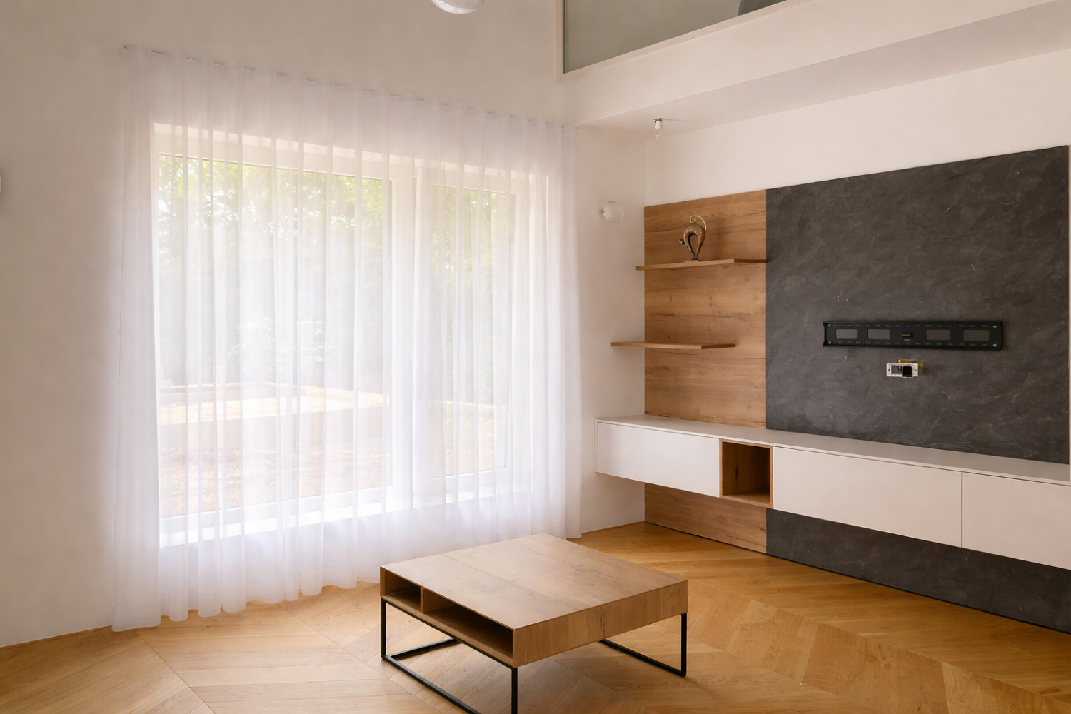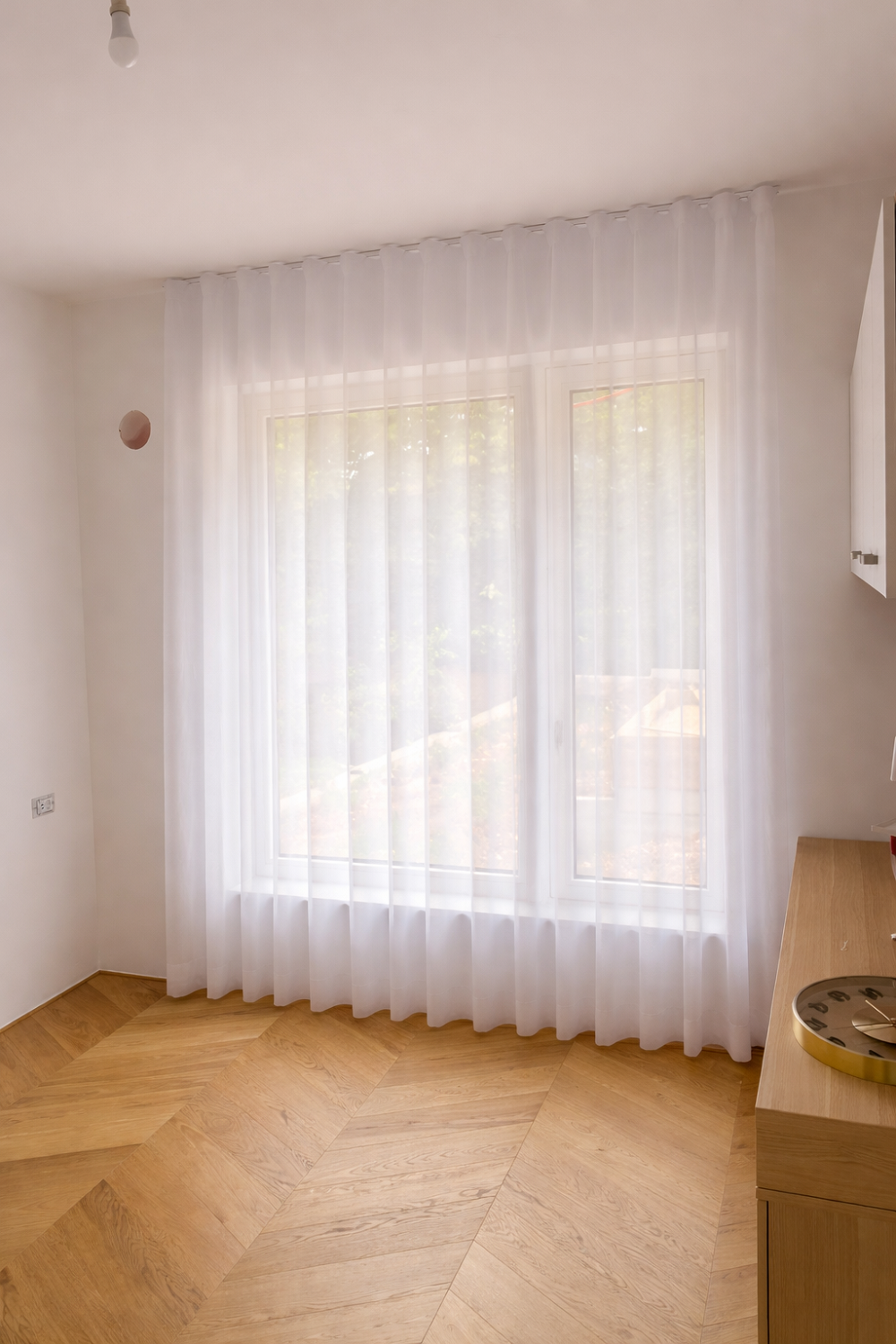 V tem projektu smo se osredotočili na ustvarjanje svetlega, umirjenega in brezčasnega ambienta, kjer ima svetloba ključno vlogo. Izbrana tkanina LUZ v barvi 01 s svojo izjemno prosojnostjo prostoru doda občutek lahkotnosti in odprtosti. Naravno bela barva deluje zelo nežno in nevtralno, zato se odlično povezuje z lesenimi elementi, toplimi bež odtenki in modernimi linijami pohištva. Posebnost tkanine je njena struktura, ki na pogled deluje kot subtilna mikro mreža – ravno dovolj izrazita, da prostoru doda teksturo, a hkrati dovolj diskretna, da ne prevzame pozornosti. Tkanina omogoča, da dnevna svetloba v prostor vstopa mehko in enakomerno, brez ostrih prehodov, s čimer se ustvari prijetna atmosfera skozi ves dan.