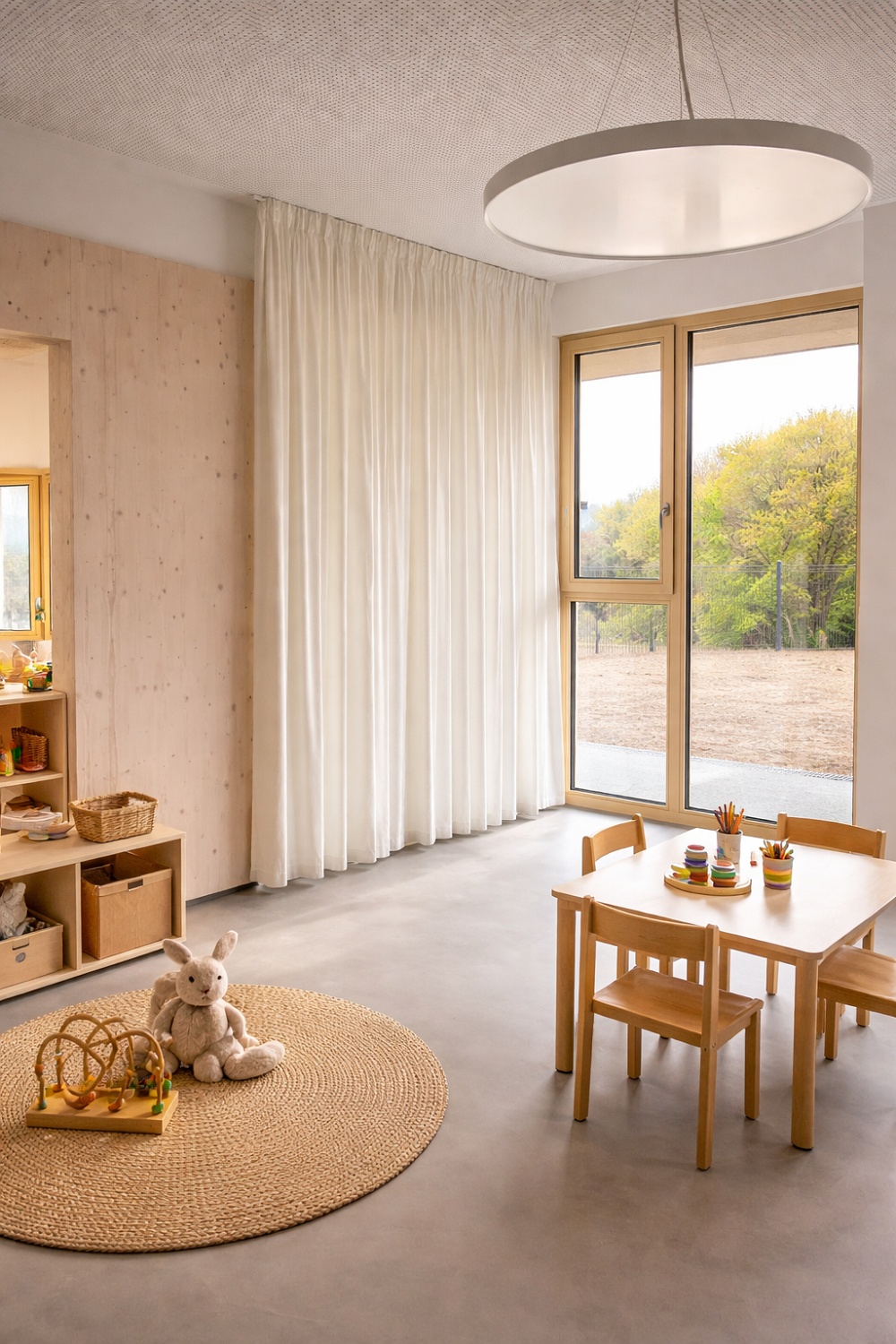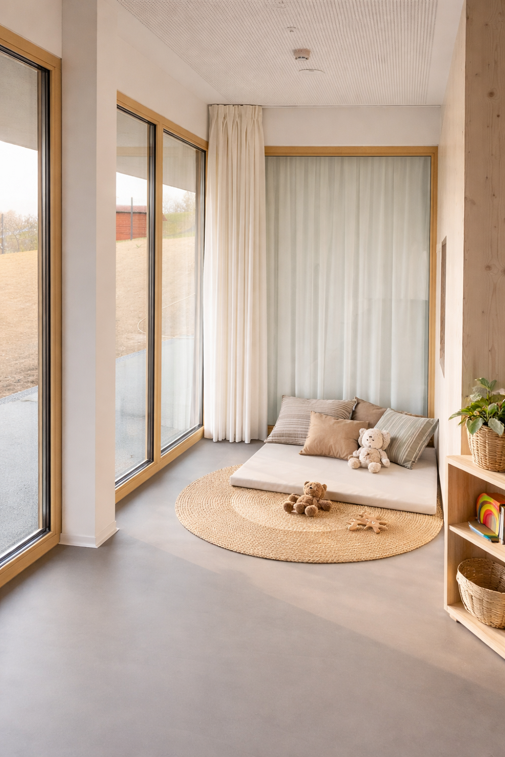 Pri opremi smo uporabili tkanine naravnih tonov, ki s svojimi nežnimi teksturami in oblikami prispevajo k občutku prijetnosti in naravnosti v prostoru. Ta izbira materialov igra ključno vlogo pri ustvarjanju okolja, kjer se otroci lahko počutijo varno in udobno, kar je še posebej pomembno za njihov psihološki in čustveni blagostanje.