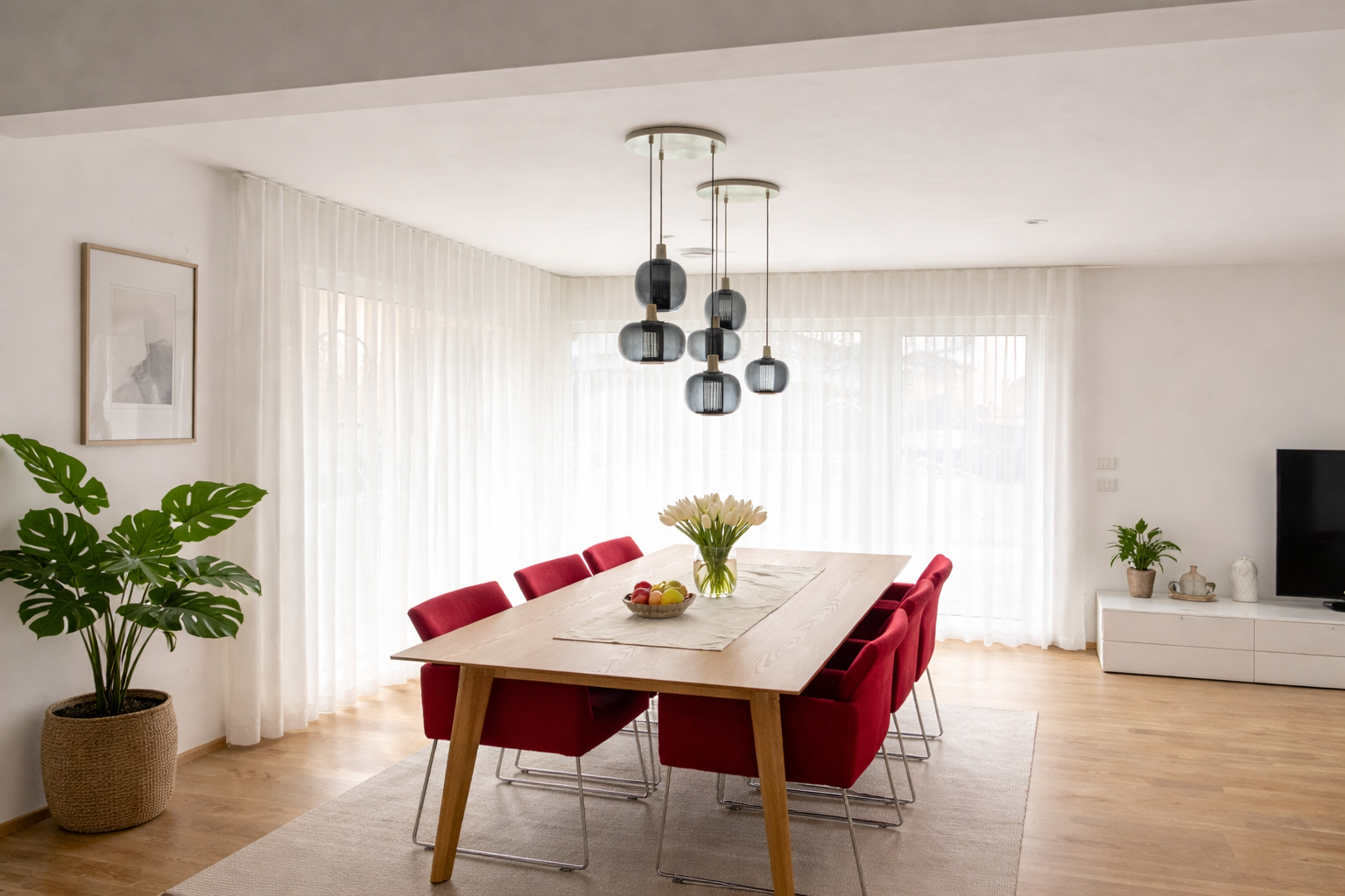 V tem projektu smo združili eleganco in prefinjenost z izjemno pozornostjo do detajlov, s čimer smo ustvarili izjemno dekorativno rešitev za sodoben prostor. Uporabili smo prosojno zavesno tkanino Floria v beli barvi, ki prostoru omogoča naravno prelivanje svetlobe in hkrati prispeva k občutku lahkotnosti ter odprtosti. Bela barva tkanine omogoča brezhibno integracijo v različne notranje sloge, saj se prilagaja tako minimalističnim kot tudi bolj dekorativno bogatim prostorom.