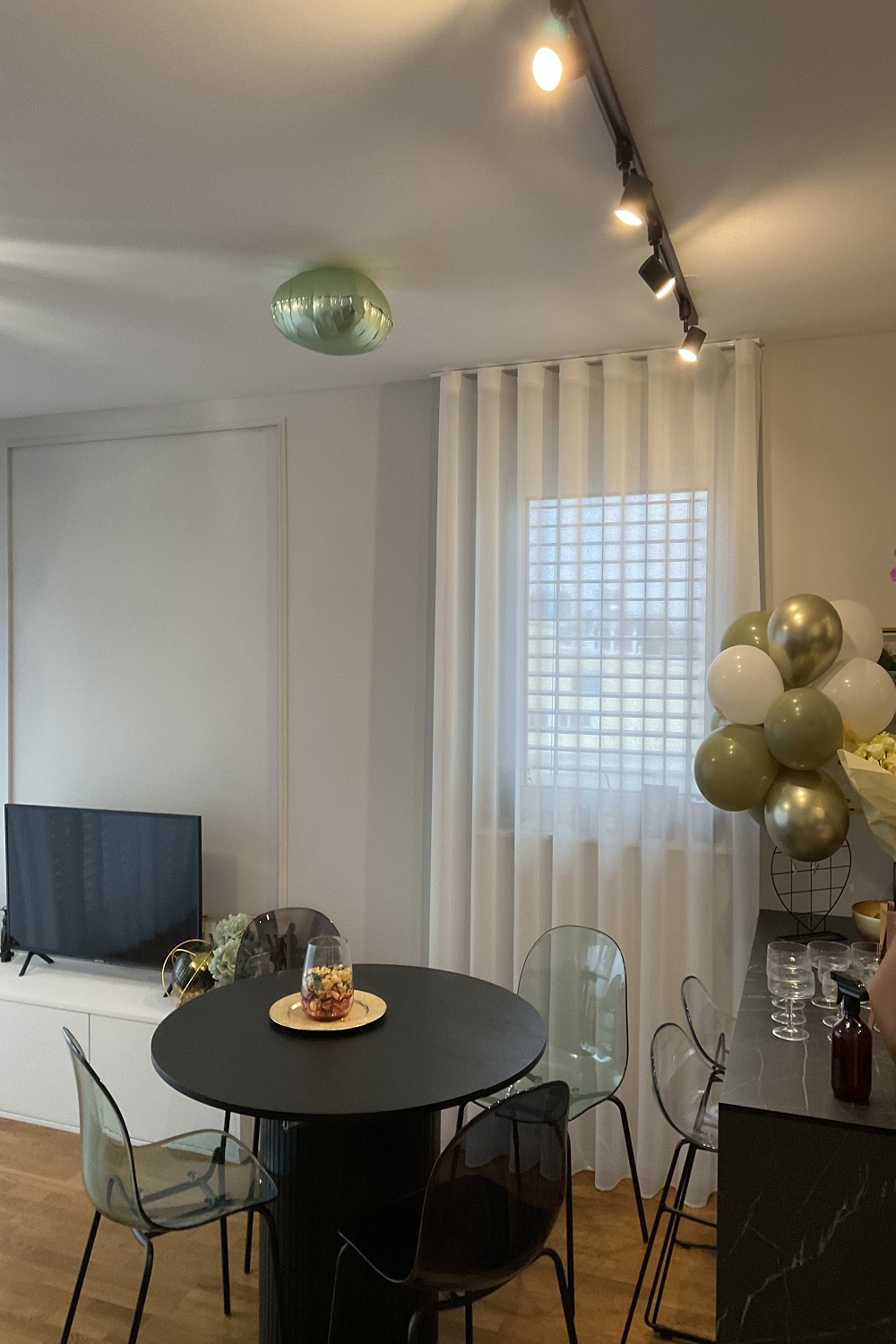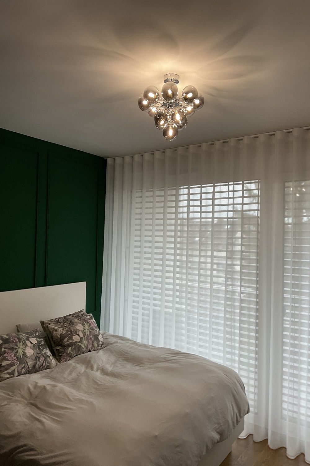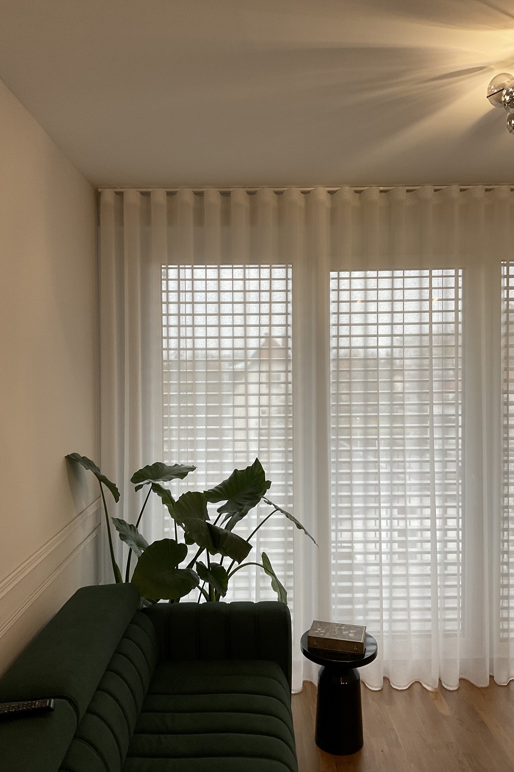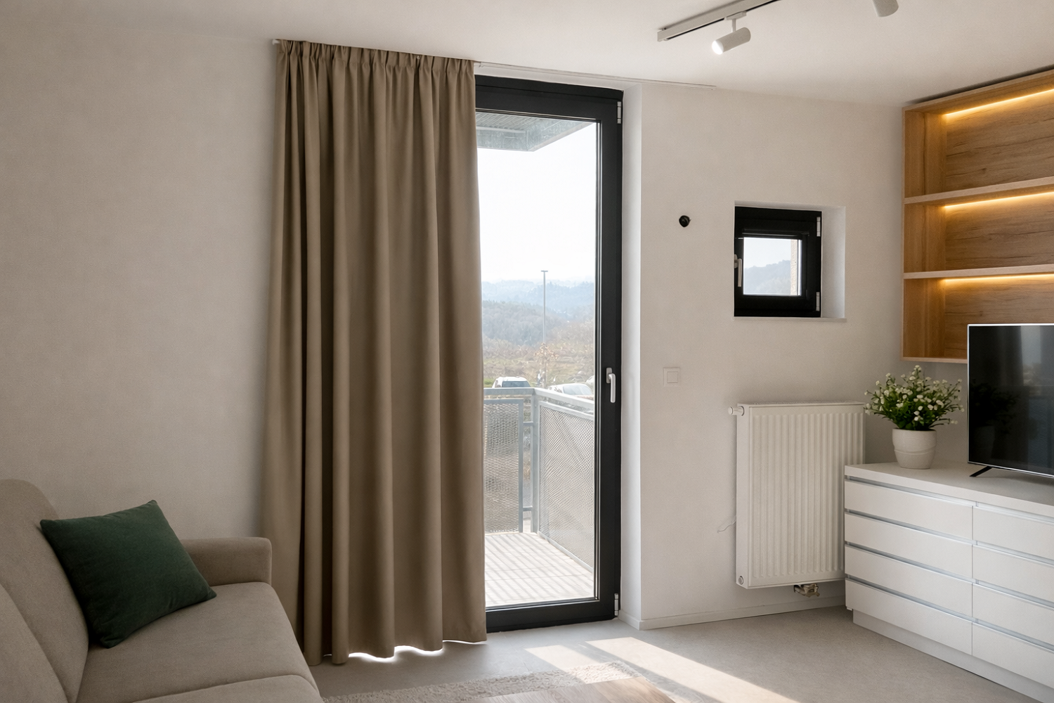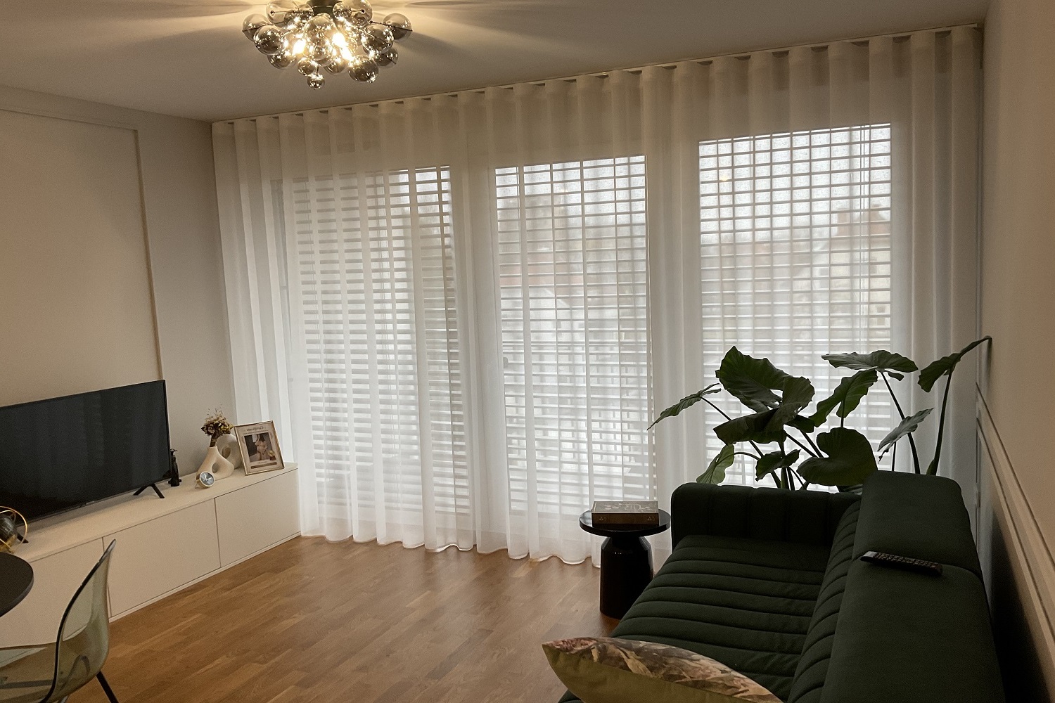 Izbrana je bila lahkotna, a dovolj gosta zavesna tkanina Cream v barvi 11, ki prostoru doda toplino in subtilen občutek elegance. Nevtralni kremni odtenek se lepo poveže z lesenimi tlemi, zelenimi poudarki in sodobno opremo ter ustvarja umirjeno, harmonično atmosfero skozi celotno stanovanje. Zavese so izdelane na valove, ki zagotavlja enakomeren, vedno urejen videz gubanja, zato ostajajo lepo zložene tako odprte kot zaprte in prostoru dodajo občutek urejenosti ter mehkobe.