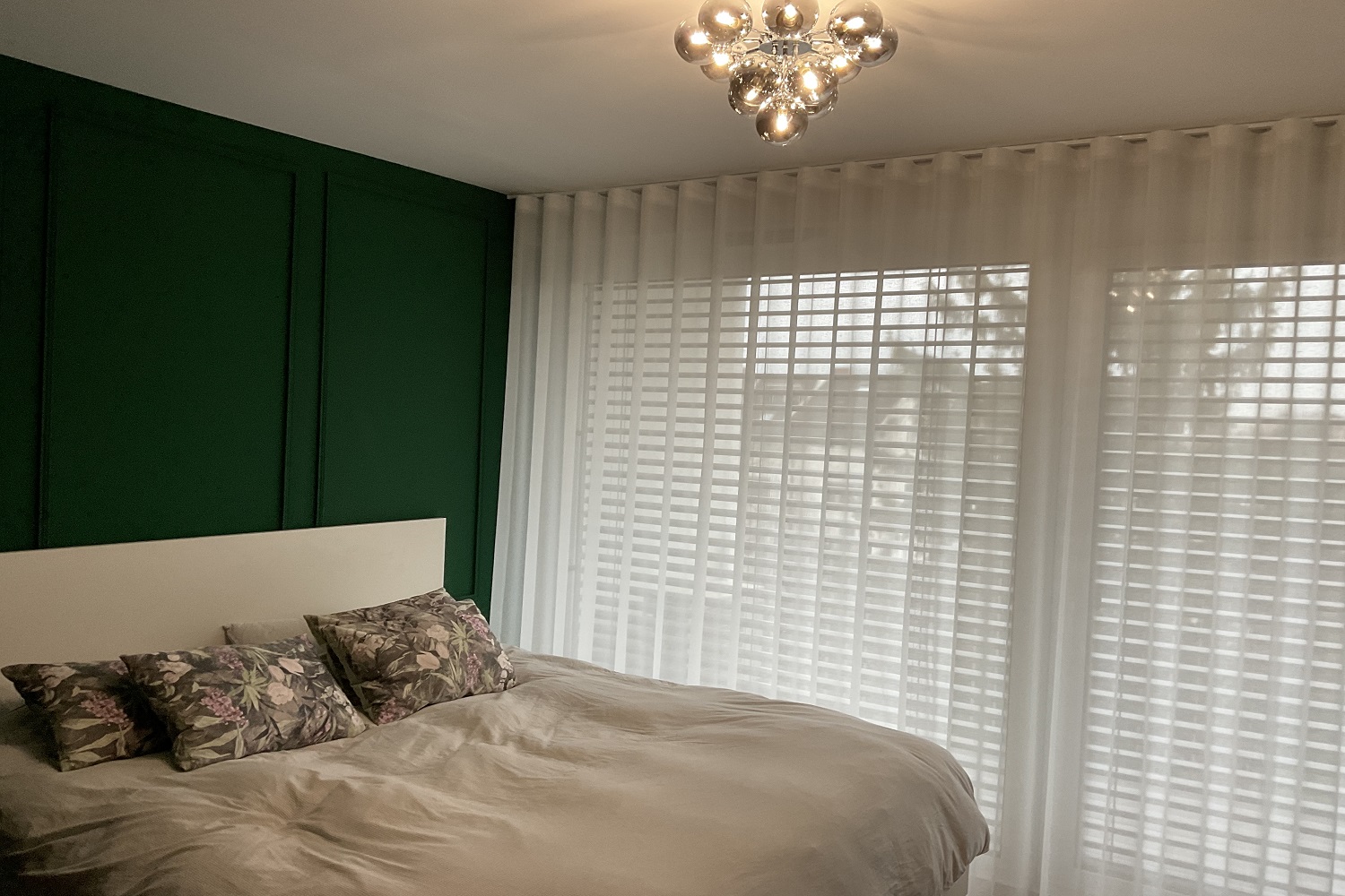 V tem projektu smo ustvarili prijetno in elegantno senčenje, ki prostoru dodaja občutek topline in razkošja. Izbrali smo žametno tkanino Melani, ki s svojo mehko teksturo in prefinjenim odsevom svetlobe ustvarja občutek udobja ter prestiža. Zavese so oblikovane v valoviti tehniki, kar zagotavlja enakomeren in moderen padec tkanine. Posebnost tega projekta je krivljena karnisa, ki omogoča tekoče premikanje zaves in elegantno prilagajanje prostoru. S tem smo zagotovili nemoteno funkcionalnost ter hkrati ohranili estetsko dovršenost.