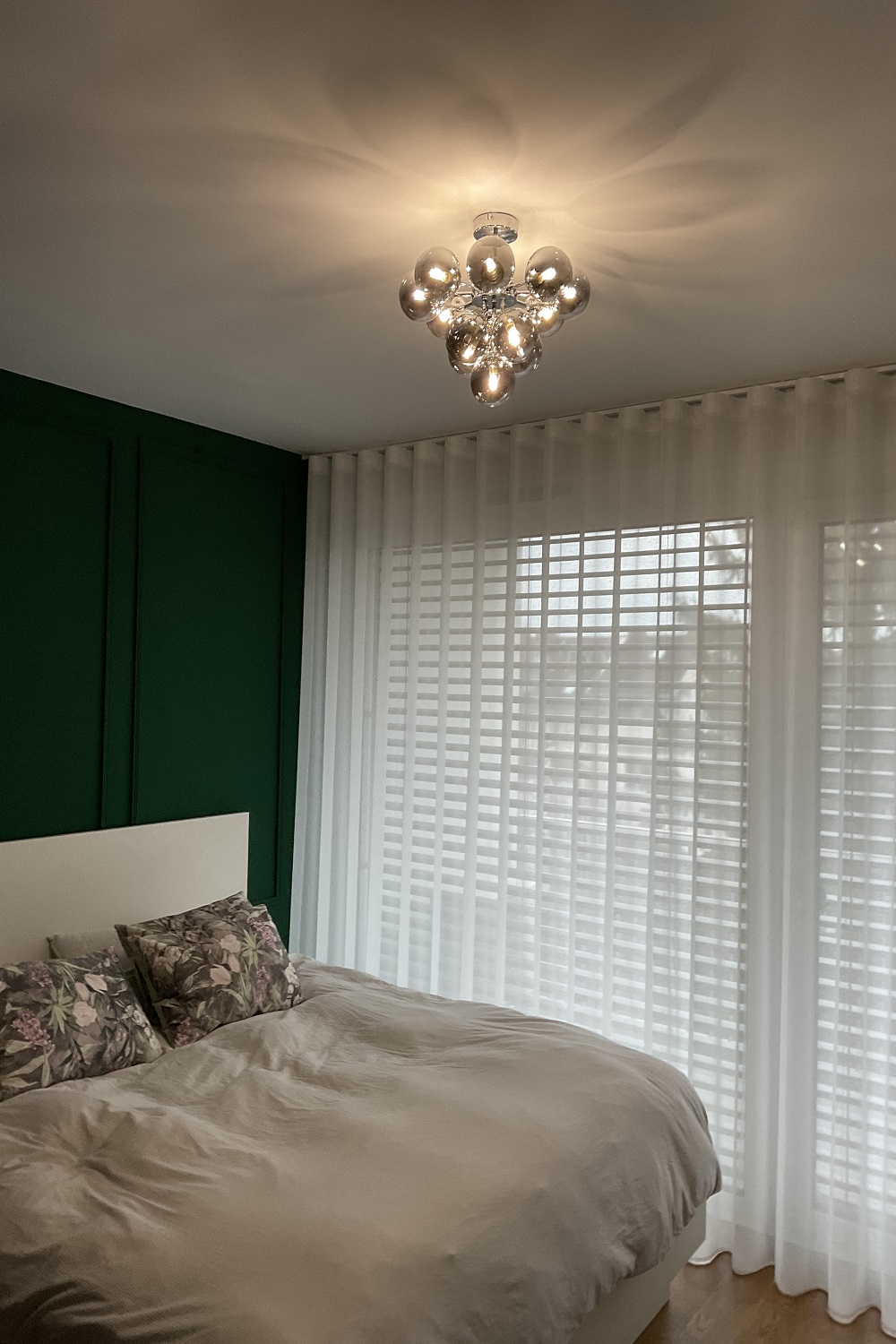Spalnica, ki jo zaznamuje mansardni strop, je zahtevala prilagojeno montažno rešitev. Karniso smo zato vgradili v strop preklade, s čimer smo dosegli popolnoma minimalističen, čist in arhitekturno dovršen videz, pri katerem je tekstil videti kot naravno nadaljevanje stropa. Poleg prosojne tkanine smo v spalnico dodali tudi blackout zaveso – artikel 1111 v barvi 08, nežne satenaste teksture, ki omogoča popolno zatemnitev prostora. Kombinacija lahkotne dnevne tkanine in funkcionalnega blackout materiala ustvarja uravnotežen sistem senčenja, ki združuje estetiko, intimnost in udobje pri vsakodnevni uporabi.