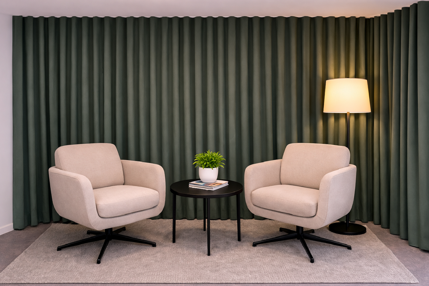V poslovnem prostoru Klarena smo zasnovali tekstilno rešitev, s katero smo kotiček za klepet preoblikovali v prijeten, umirjen in funkcionalen del interierja. Zavesna postavitev mehko razdeli odprt prostor ter ustvari bolj intimno vzdušje, primerno za sproščene pogovore, krajše sestanke ali umik v mirnejši del prostora. Tekstil v poslovnem okolju pomembno vpliva tudi na akustiko, saj zmanjšuje odmev ter prostoru doda občutek topline in vizualne uravnoteženosti.