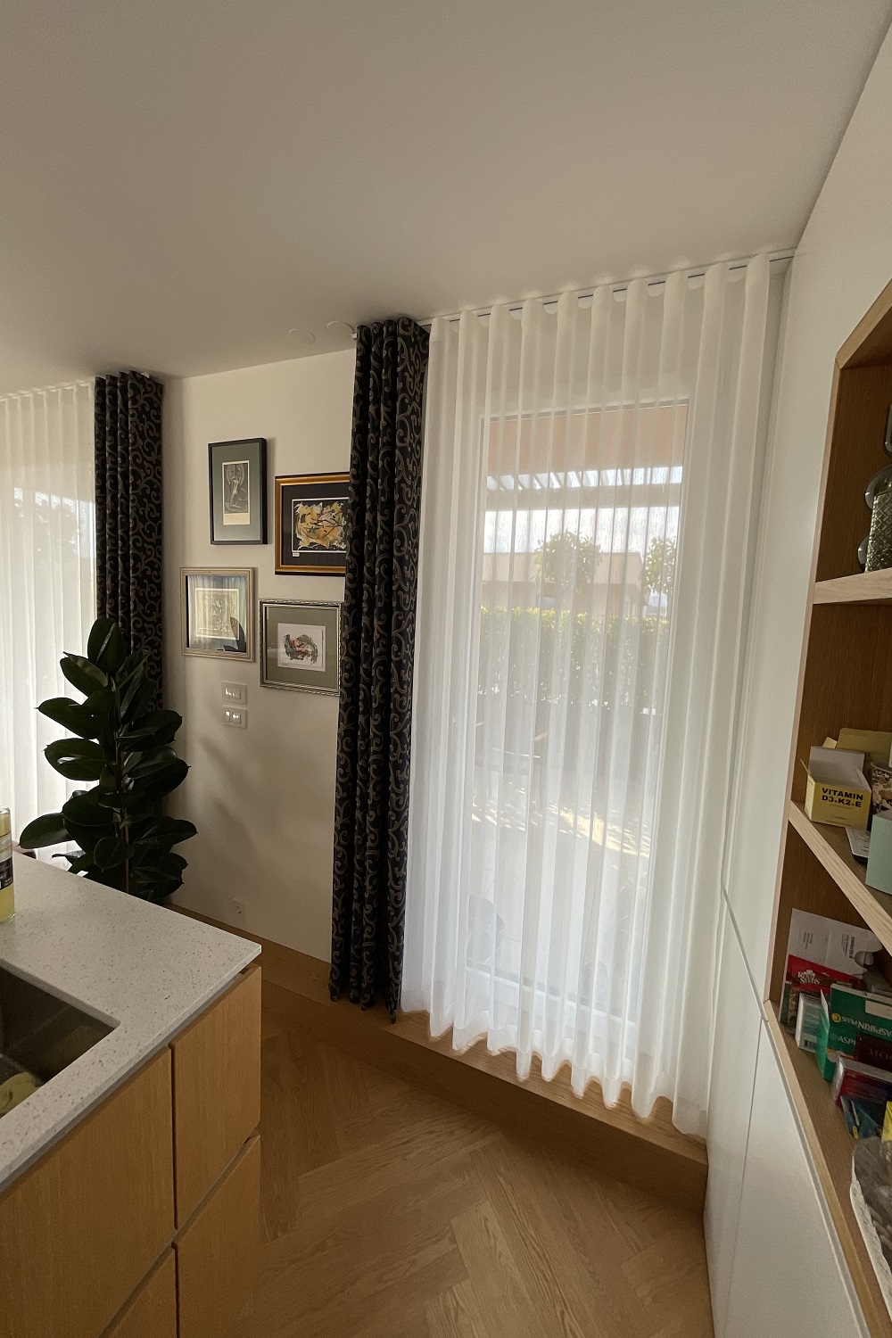 V dnevnem prostoru smo za popolno funkcionalnost in estetsko kontinuiteto namestili krivljene karnise Forest. Te omogočajo tekoče pomikanje zaves tudi v vogalnih prehodih ter zagotavljajo neprekinjen vizualni tok med prostori. Zaradi skrbno načrtovanega krivljenja karnis se zavese elegantno pomikajo okoli arhitekturnih izzivov, kar prostoru daje posebej prefinjeno in povezano celoto.