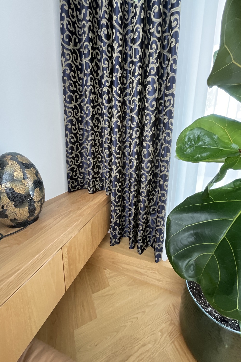 Uporabljena je prosojna tkanina Corfu v barvi 2, ki ima površino fine mikro mrežice. Zaradi takšne strukture je izjemno lahka, zračna in prijetno prosojna, zato omogoča nežno filtriranje dnevne svetlobe ter ustvarja občutek odprtosti in prostornosti. Izbrana je bila v krem barvi, ki se zelo lepo povezuje z lesenimi talnimi površinami in toplimi naravnimi odtenki interierja. Svetloba skozi tkanino prehaja mehko in enakomerno, brez ostrih kontrastov, kar prostoru daje umirjen in sproščen značaj. Prosojno osnovo dopolnjuje dekorativna tkanina Hermitage v barvi 8402-75, ki prostoru doda izrazit poudarek in občutek razkošne elegance. Gre za bogato žakardirano tkanino z izrazito strukturo in ornamentalnim vzorcem, ki ustvarja zanimivo igro svetlobe in sence. Njena globoka, prestižna modra barva prostoru doda vizualno globino ter poudari vertikale prostora, hkrati pa deluje pomirjujoče in sofisticirano. Polnejši padec tkanine ustvarja reprezentativen videz, ki subtilno kontrastira lahkotnosti prosojnih zaves. Zavese so izdelane v obliki valov, kar zagotavlja enakomerno, elegantno padanje tkanine ter sodoben, urejen videz. Nameščene so na vodila KS Forest v beli barvi, ki se diskretno vključijo v prostor in omogočajo tiho ter gladko premikanje.